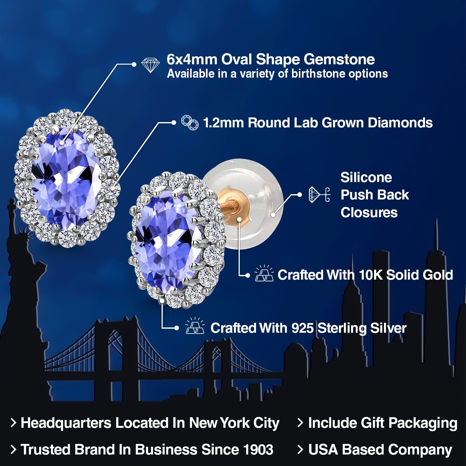 10K Solid Gold Post and Sterling Silver 6X4MM Oval Gemstone Birthstone and White Lab Grown Diamond Halo Earrings For Women