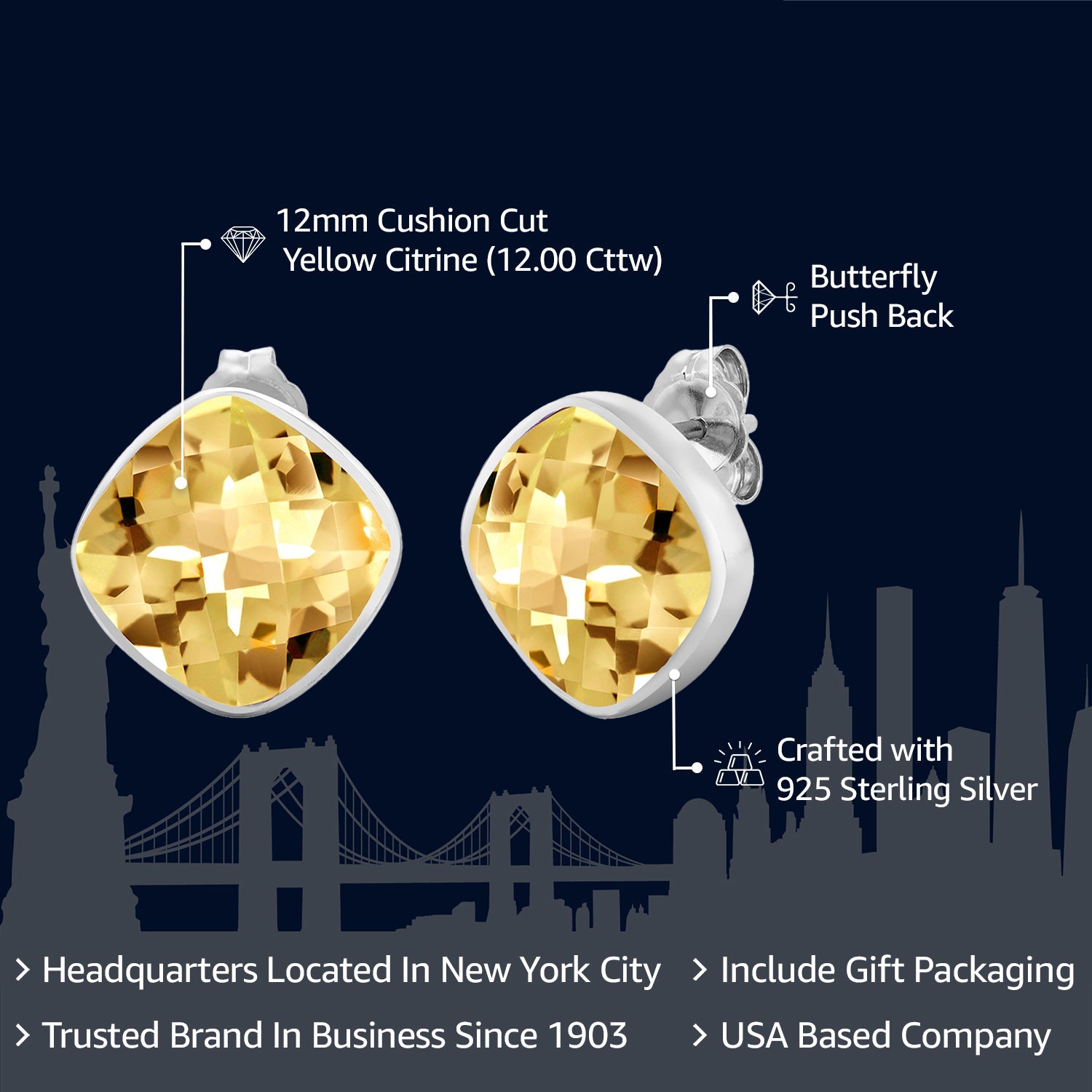12.00 Cttw Citrine Stud Earrings For Women Men In 925 Sterling Silver | Gemstone Birthstone | Cushion Cut 12MM
