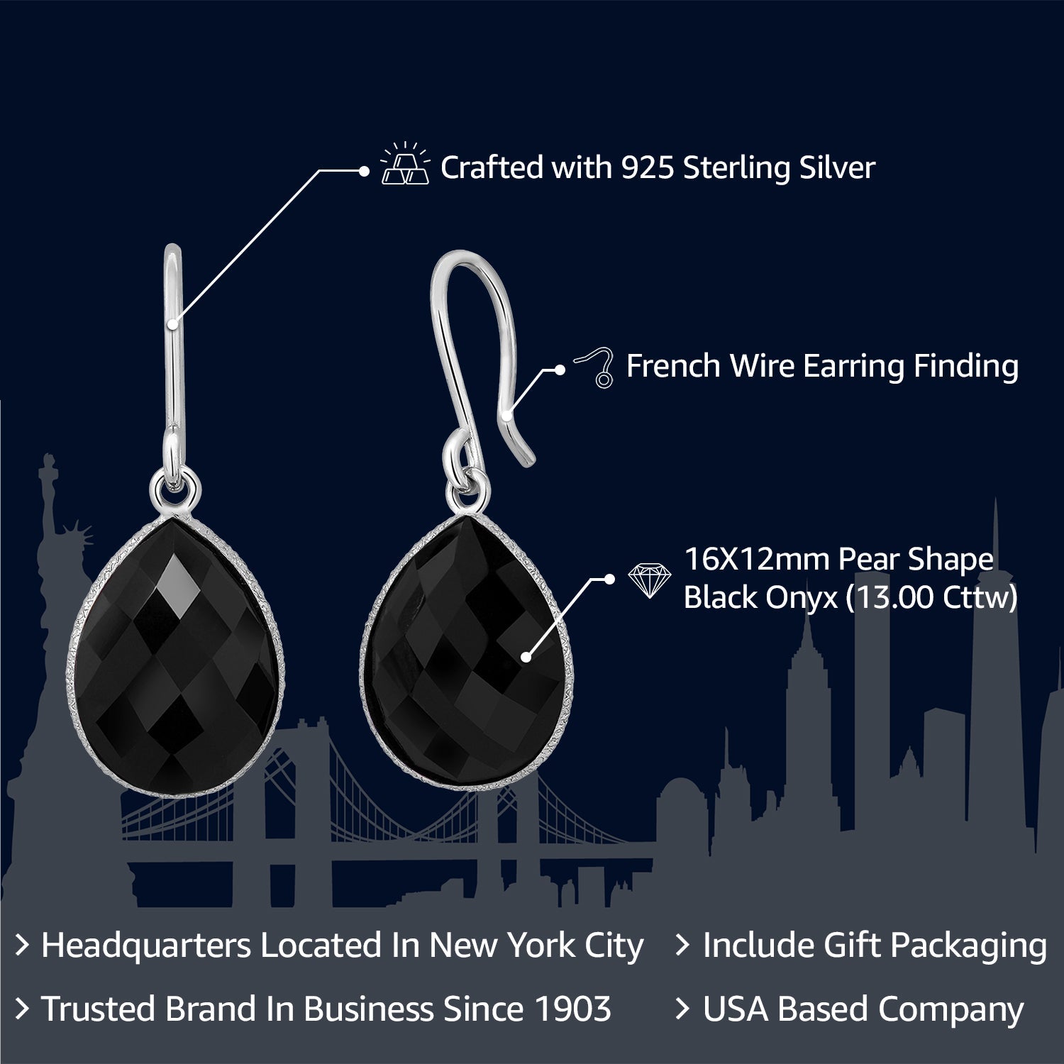 PEAR SHAPE ELEGANCE: The pear-shaped 16x12mm black onyx gemstones add an element of timeless beauty to the earrings. The gemstones' facets catch and reflect light, creating a mesmerizing play of color and brilliance.