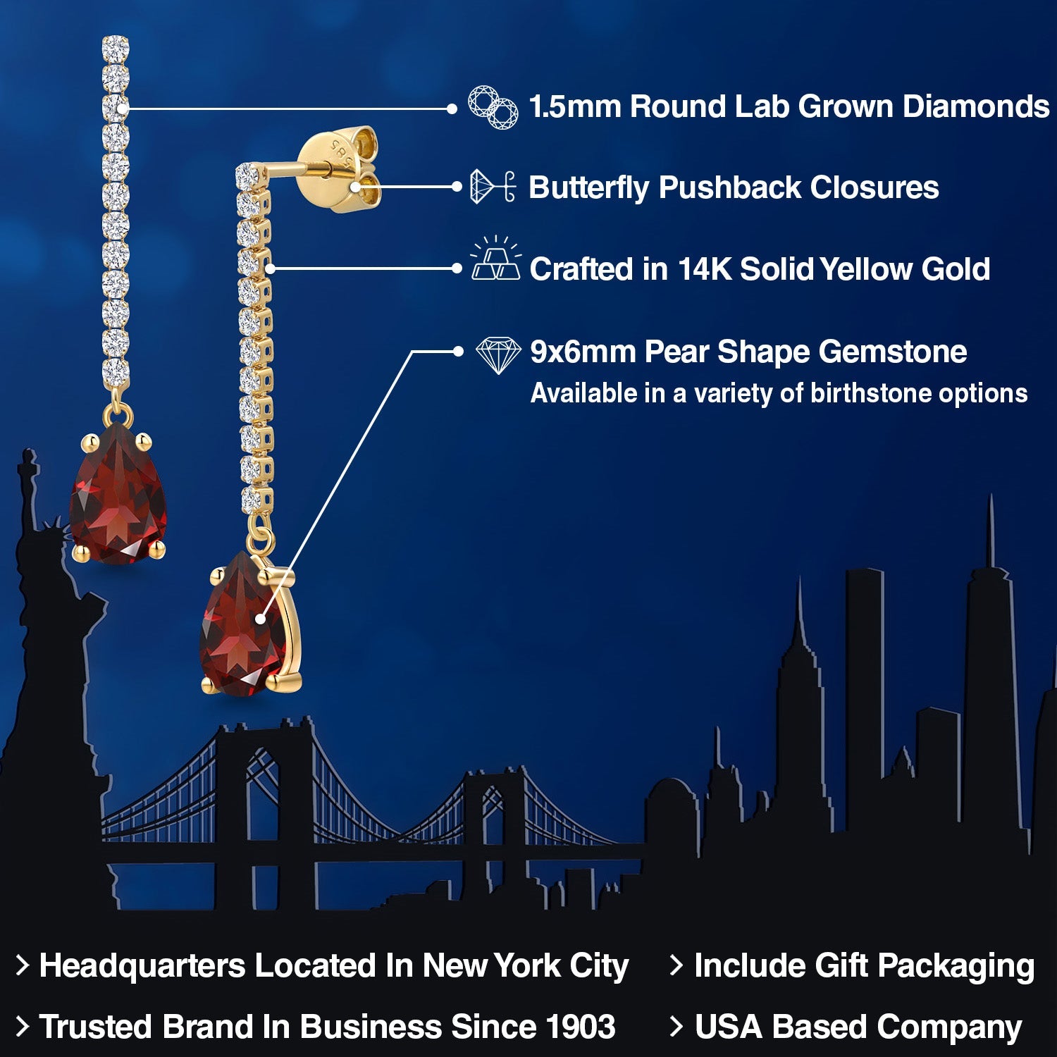 14K Yellow Gold Gemstone Birthstone and Lab Grown Diamond Long Liner Dangle Earrings for Women | Pear Shape 9X6MM and Round 1.5MM | Yellow Gold Chain Drop Earrings