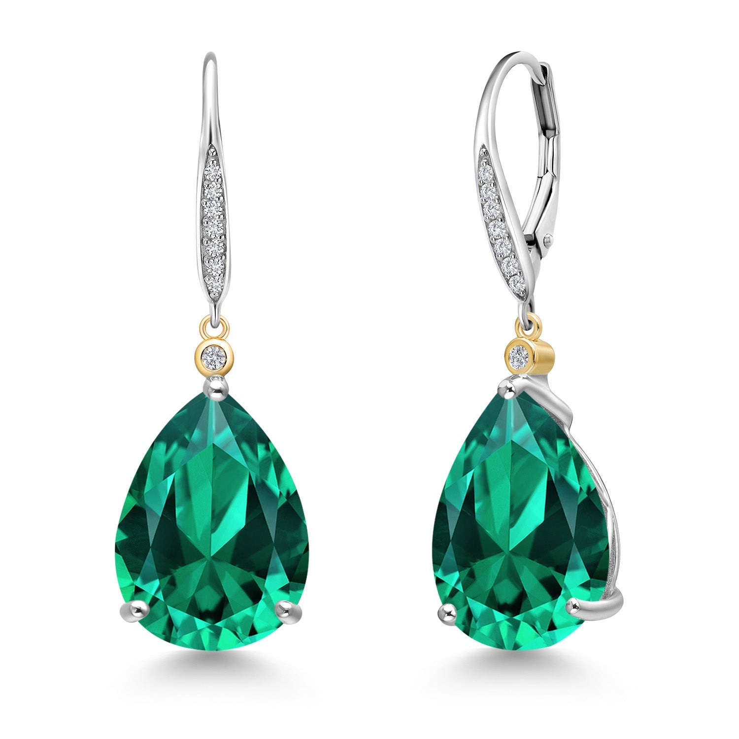 ELEGANT DESIGN: These 925 silver and 10K yellow gold dangle earrings feature an impressive 16.53 Cttw of vivid Green Nano Emerald in pear shapes (16X12MM), accented by sparkling White Lab Grown Diamonds, offering a sophisticated and luxurious look.