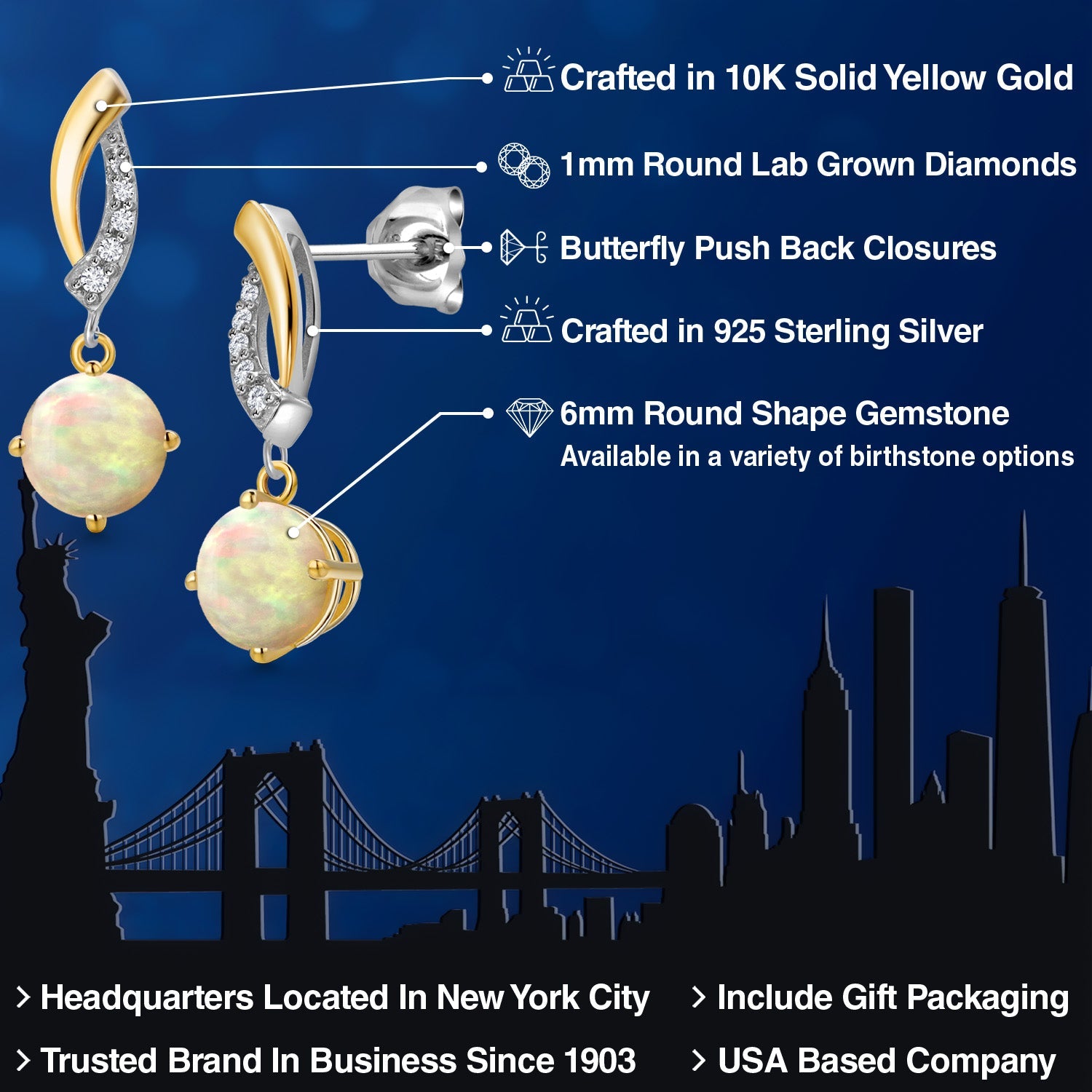 LUSTROUS 6MM GEMSTONE ELEGANCE: These dangle earrings feature a radiant 6MM round gemstone, available in a variety of birthstone options. This choice allows for personalization and adds a meaningful touch, as wearers can select a gemstone that represents their birth month or a color that holds special significance. The large gemstone delivers exceptional brilliance, offering a beautiful display of color and elegance that suits both casual wear and formal occasions.
