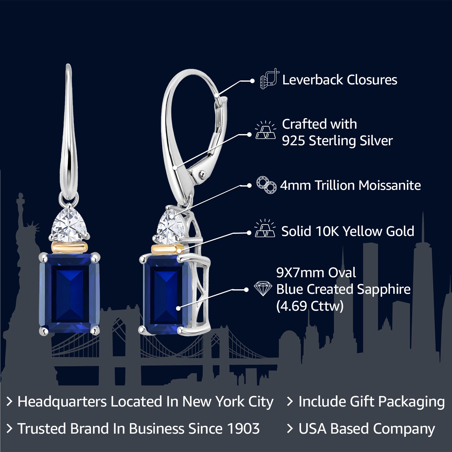 ELEGANT FUSION: Elevate your style with the exquisite fusion of 925 sterling silver and yellow gold. The Gem Stone King Dangle Earrings feature stunning 9X7MM blue created sapphire and 4MM white moissanite gemstones, creating a harmonious blend of elegance and sophistication.