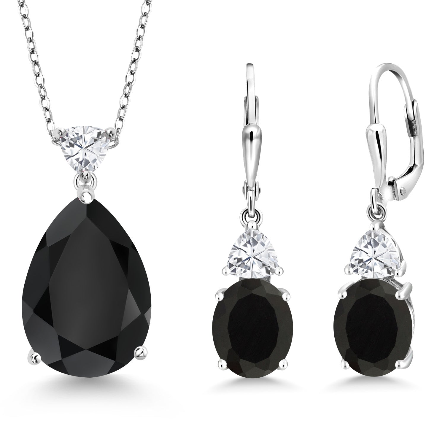 925 Sterling Silver Black Onyx and White Zirconia Pendant Earrings Jewelry Set For Women (17.22 Cttw, Pear Shape 18X13MM, with 18 Inch Chain)
