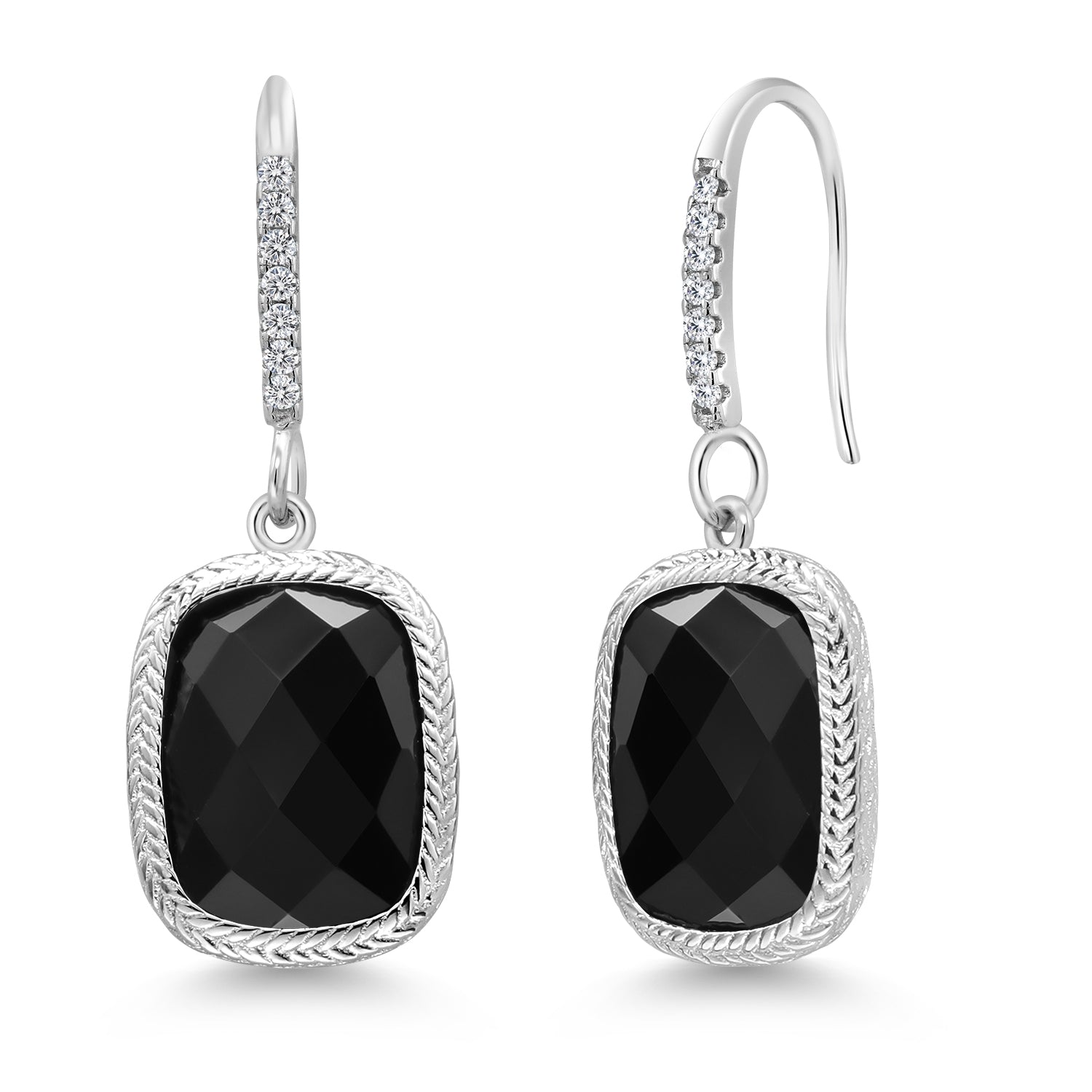 925 Sterling Silver Black Onyx Drop Dangle Earrings For Women (4.60 Cttw, Gemstone Birthstone, Cushion Checkerboard Cut 13X9MM)